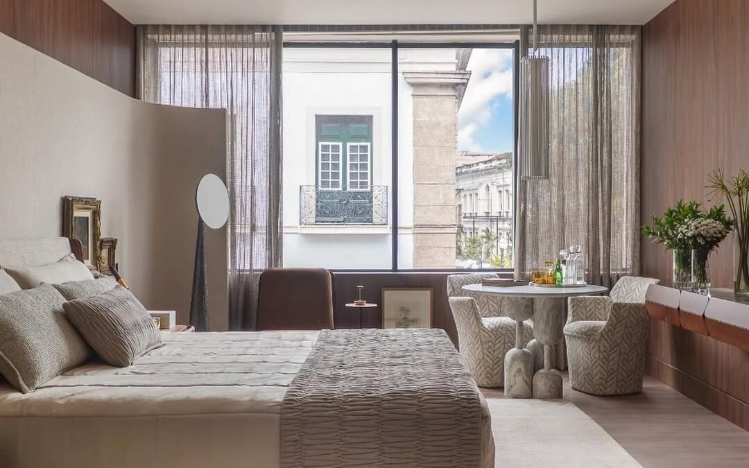 Na área do dormir, a cabeceira curva abraça a cama e as mesas de cabeceira, reforçando a sensação de abrigo e aconchego. Essa cabeceira é revestida por um papel de parede tipo tecido que traz ainda mais conforto para o espaço. A paleta em tons de bege, associada à madeira escura, e escolha do mobiliário reforça ainda mais o conceito do espaço. Móveis de design brasileiro de renomados designers como Jader Almeida, Ronald Sasson e Roberta Banqueri dividem a cena com as peças de antiquário, trazendo a atmosfera sofisticada do século XIX para o presente e reinterpretando-a sob uma ótica contemporânea. Esse gesto arquitetônico sintetiza a proposta do ambiente: unir funcionalidade e poesia em uma atmosfera atemporal, onde memória e modernidade coexistem em homenagem ao poeta da liberdade.